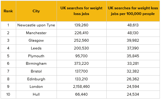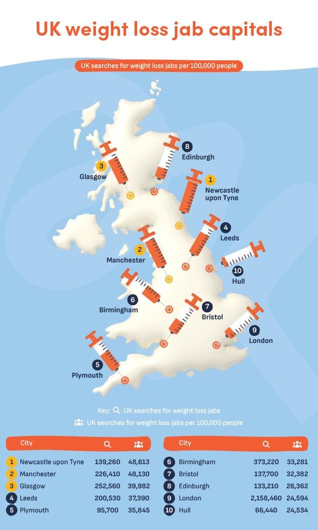 - Some cities are far more interested in weight-loss injections than others. Newcastle and Manchester residents are searching at roughly twice the national average.