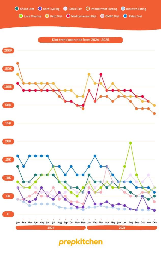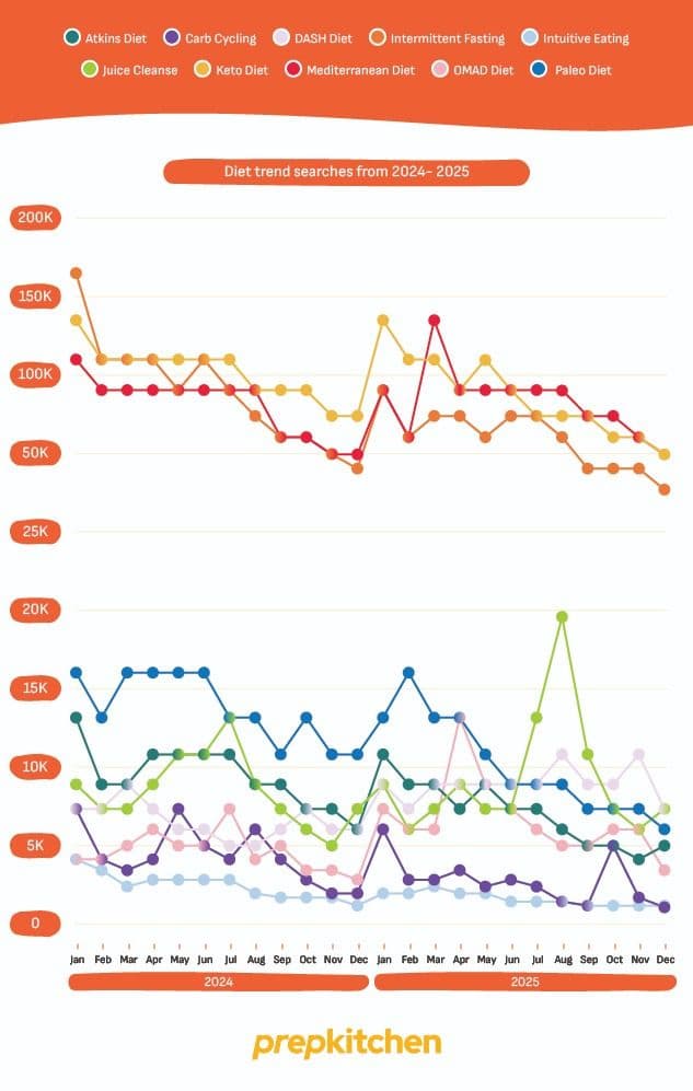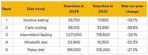 Even after a drop of one-third (33.1%) in annual searches, intermittent fasting remains one of the most popular diets in the report. Searches fell from 1,071,000 in 2024 to 716,600 in 2025 – still a significant volume by any measure.