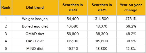- Weight loss jabs have gone mainstream. Searches peaked at nearly 1.8 million in a single month in late 2025, and interest in the term jumped almost fivefold year-on-year.