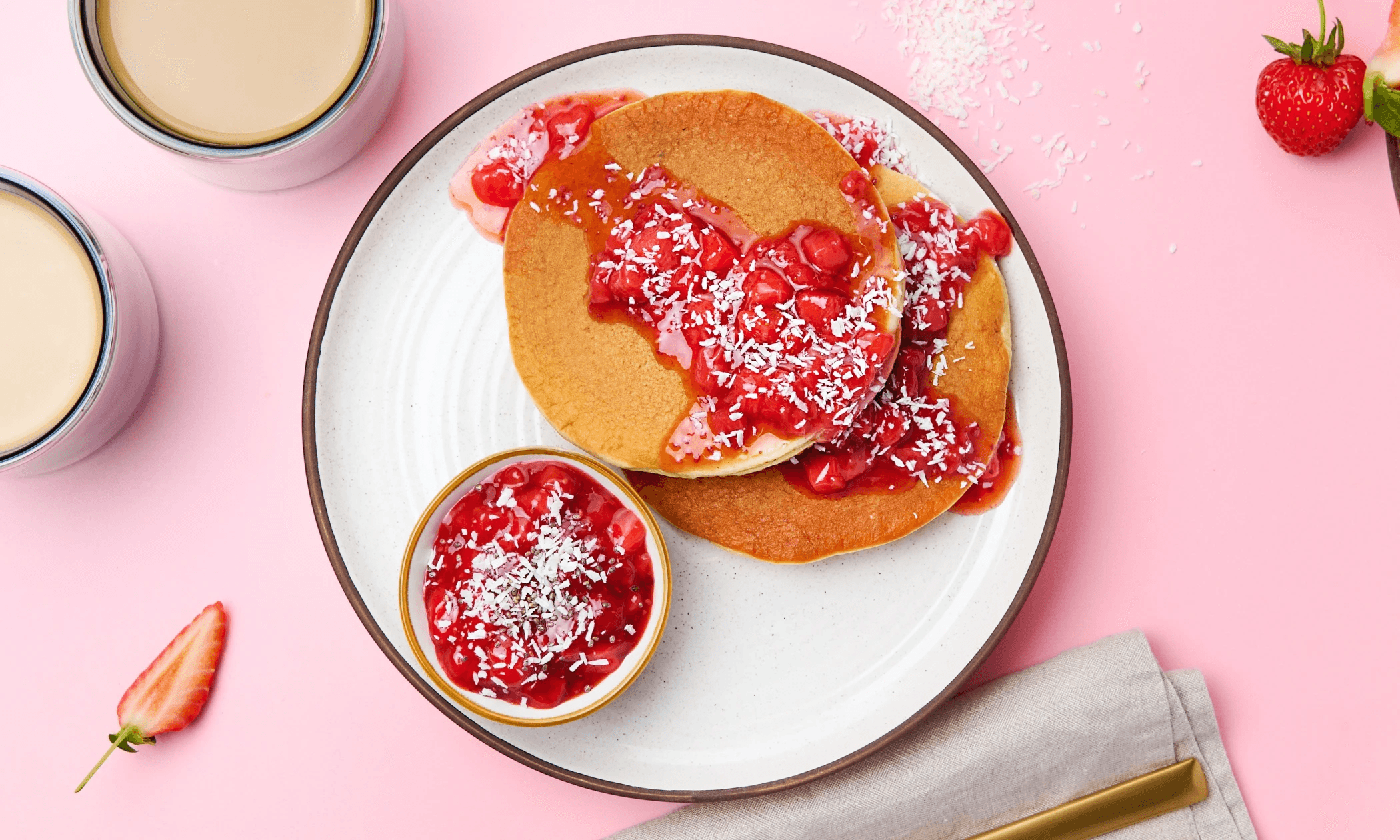 With almost 28g of protein, these fluffy, hand-cooked, high-protein pancakes, served with a homemade strawberry compote, are a tasty treat to start your day.